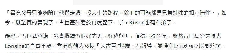 知道古巨基的人都清楚,他出生在1972年,而他的老婆Lorraine比他大几岁,今年差不多57岁左右。懂点常识的人都知道,到了这个年纪的女人,身体的各项机能都早就大不如前,别说怀孕了,很多人可能早已经到绝经那步了。Lorraine竟然能在快六十岁的时候,在这个世界上又迎来一个新生命,真让人觉得不可思议。不管是靠自然受孕还是借助科技手段,这种情况在医学界和娱乐圈里都算得上少见的例子。